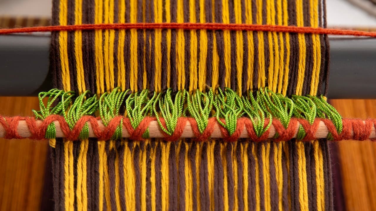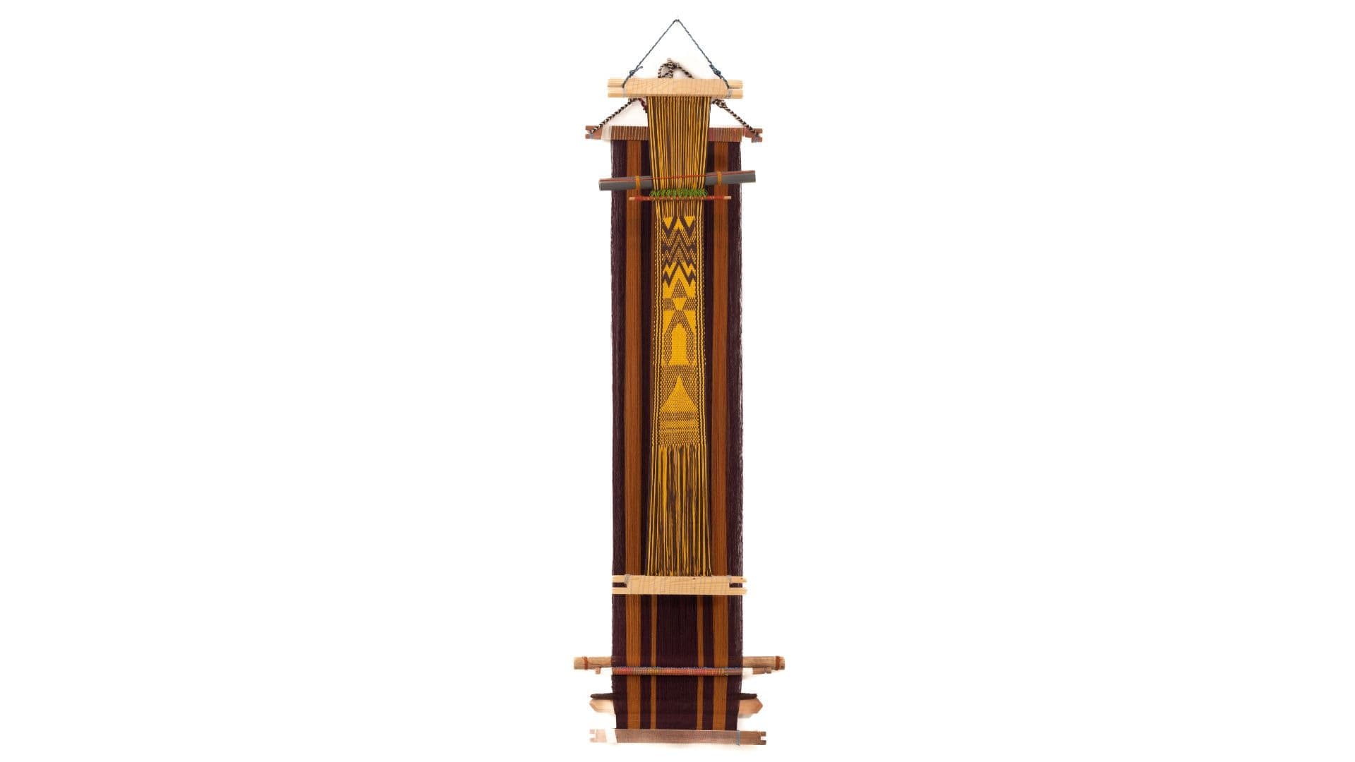 Conversaciones con el telar, 2022-2023, 230 x 370 cm, Backstrap loom installation, alpaca, cotton, hand-dyed yarn with natural dyes, synthetic yarn, industrial cord, Andean backstrap loom tools; © Juan Pablo Murrugarra