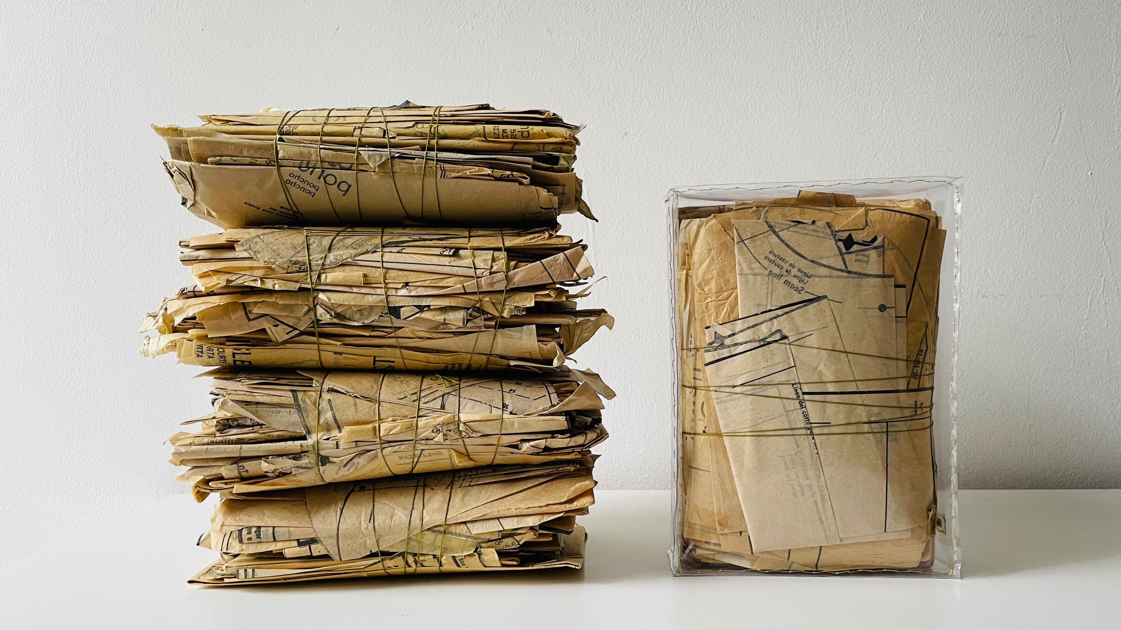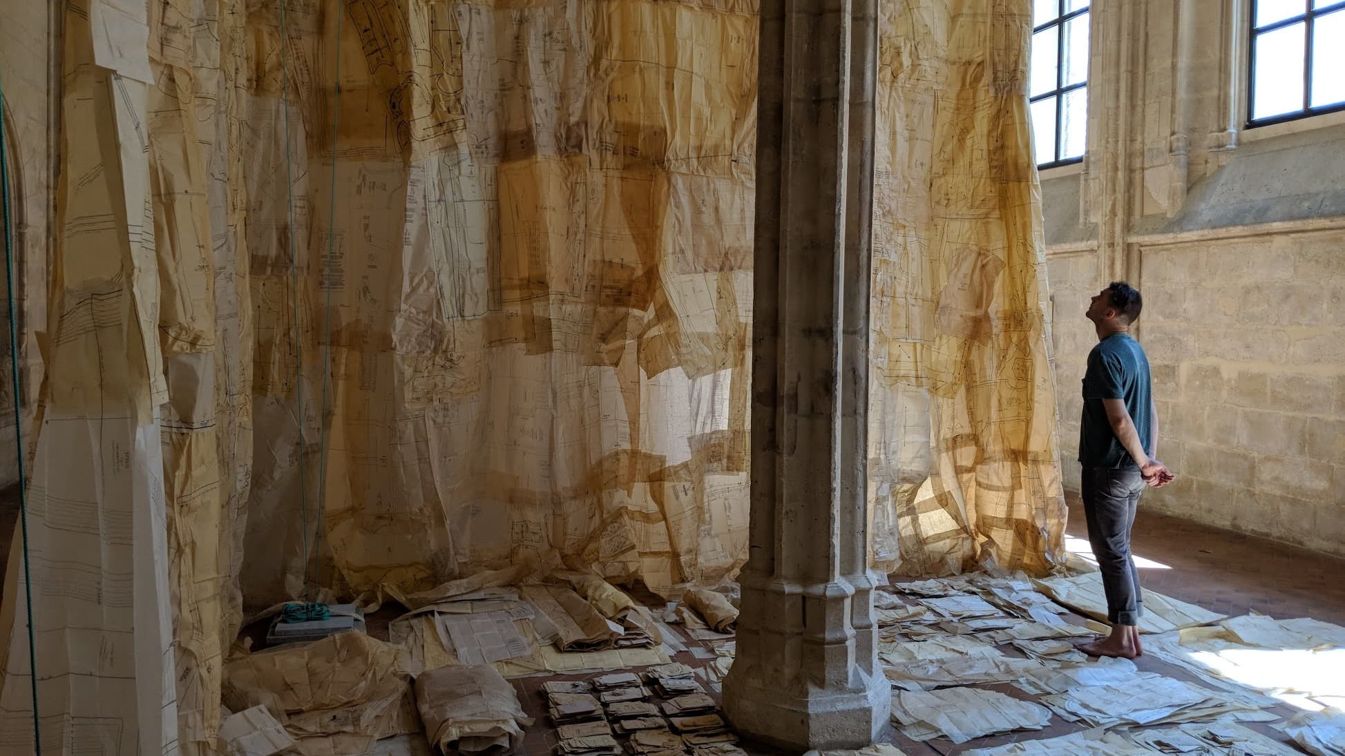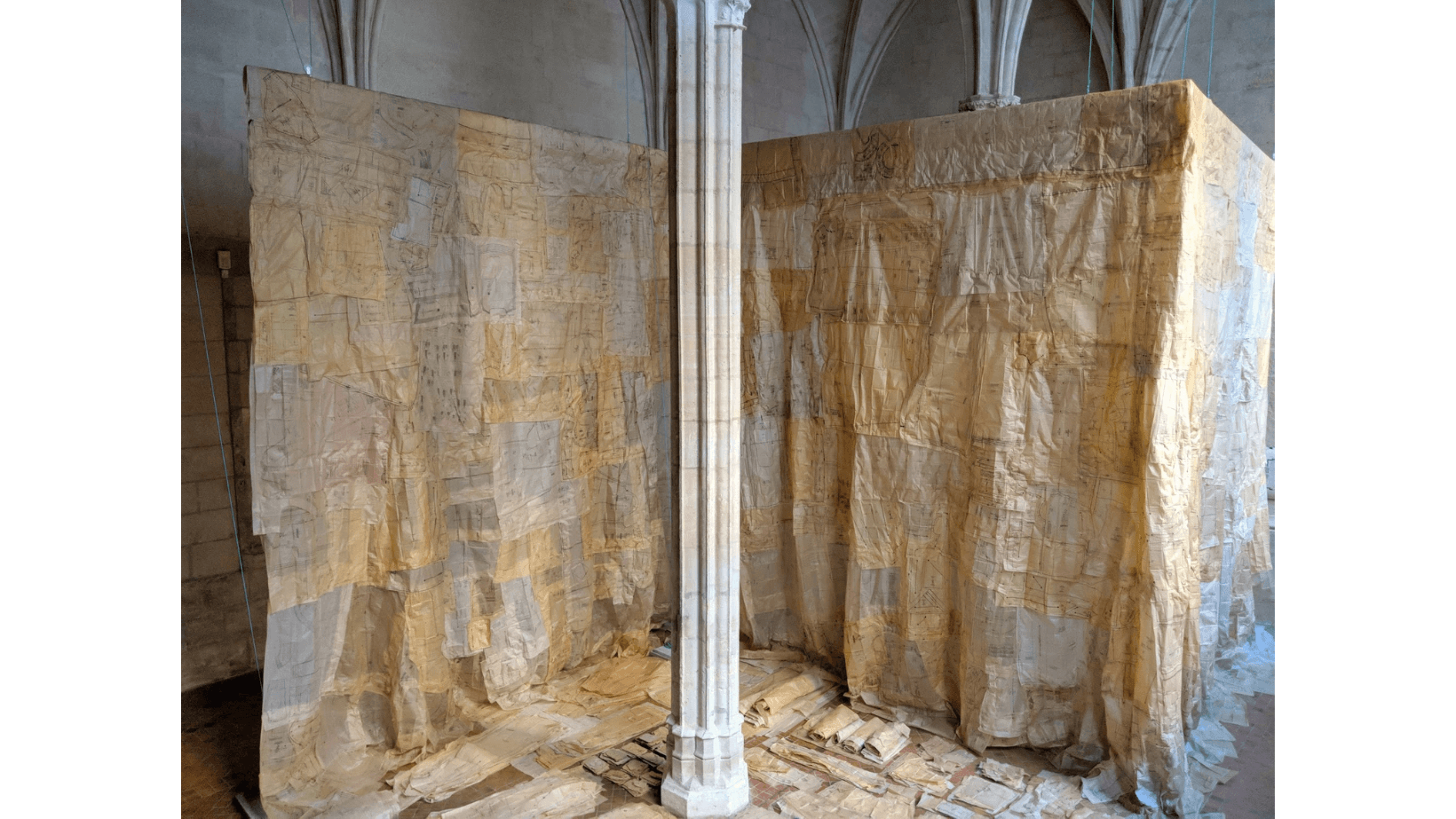 Natalia Villanueva Linares, LA DESMEDIDA, 2018 Collège des Bernardins, Paris; Hundreds of used patterns 7000 straight pins, 15m x 6m, (c) Natalia Villanueva Linares
